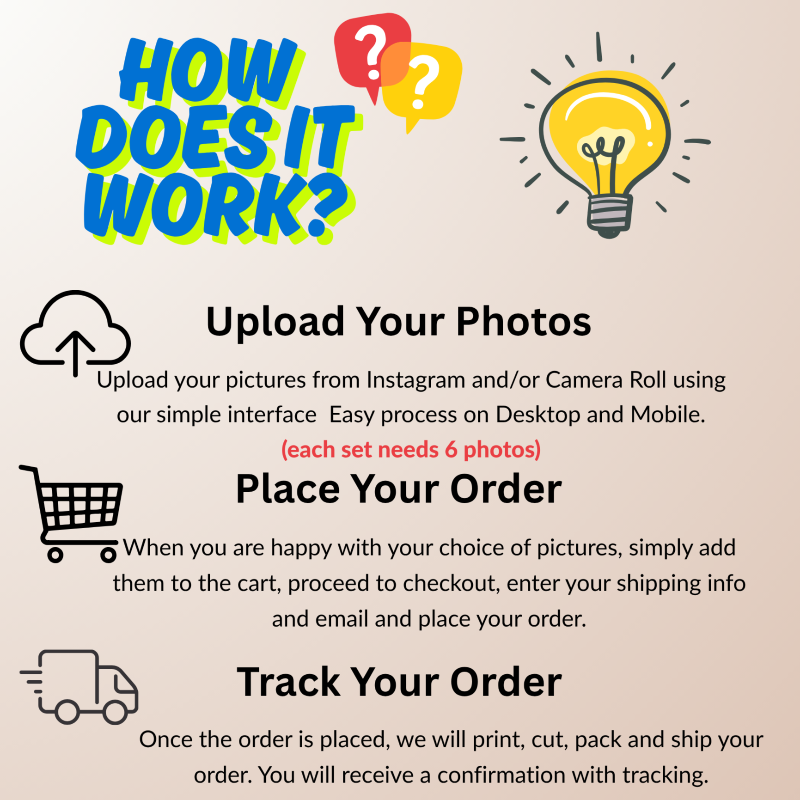 1️⃣Upload your photos and place your order (each order requires 6 photos)